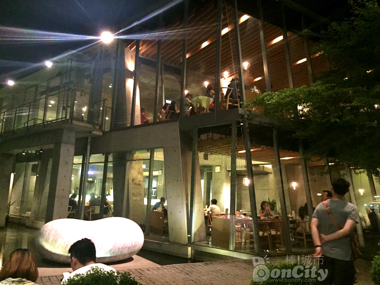 二樓用餐,往上踏步,沿著斜坡綠意盎然的綠色牆圍及探照燈引路