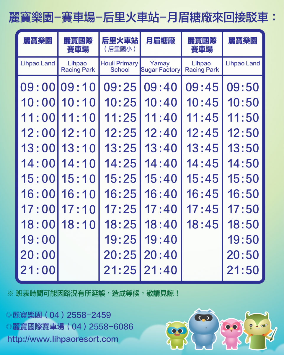 接駁車地點:后里火車站(后里國小前)及月眉糖廠 (豐原客運站牌)