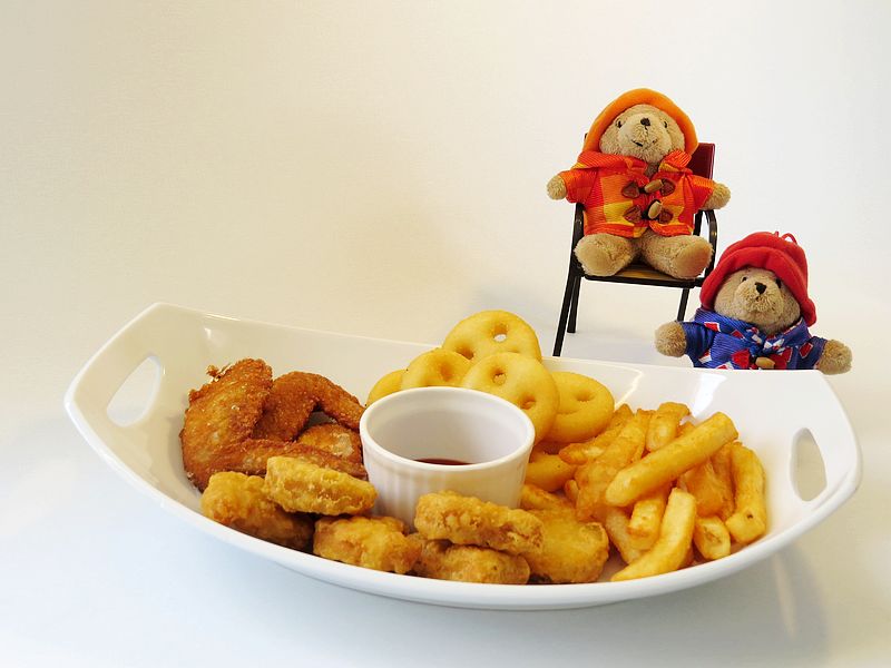 有薯條、炸雞翅、雞塊、微笑薯餅,各個都炸得金黃舒脆,再搭配番茄醬,儼然成為小孩子最愛的炸物拼盤。