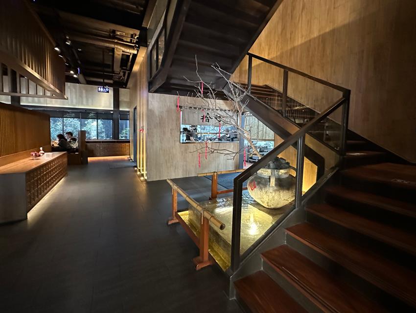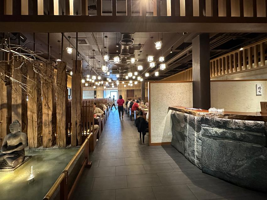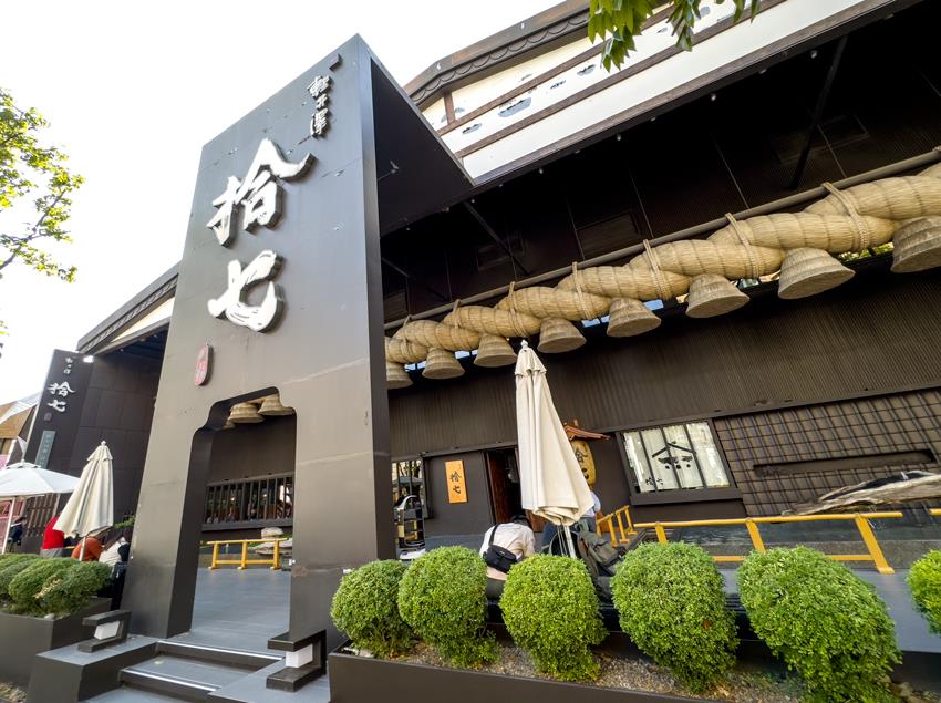 黑褐色建築、日系風格裝潢,餐廳正門上方橫掛巨型草編繩,大門前左右各是水池造景與等候座椅。