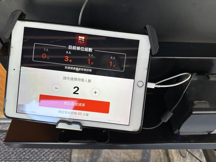 門口處有設置平板取號機,輸入用餐人數再按紅色按鈕就會出候位單,平板也會顯示有幾組正在候位。