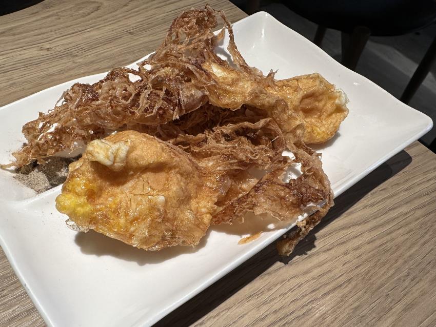 炸蛋蛋白的部分就如圖一般,有點炸過頭,變乾扁了,即使泡過湯底仍覺得失去酥香的口感。
