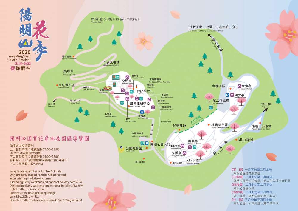 管制地點:復興橋頭、至善路2段1巷巷口、上山管制時段為07:00-16:00,下山管制點為陽明路一段中橫街口、下山管制時段為14:00-18:00